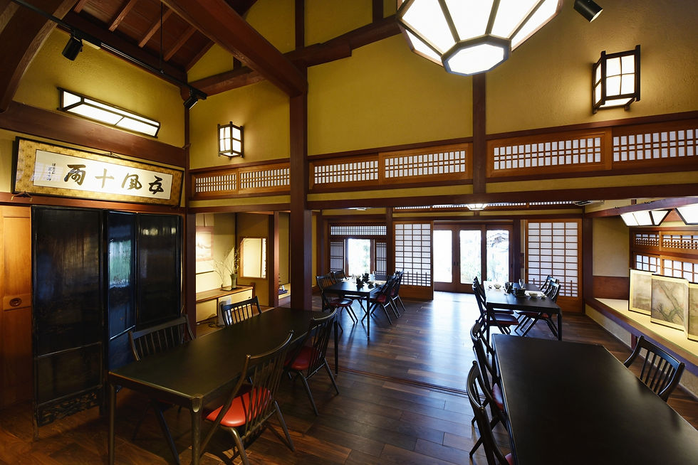 Nishiyamato Saeki is a Sukiya-style restaurant where guests enjoy authentic kaiseki cuisine in a refined setting. The 4,000㎡ garden, with its dry landscape and views of Mount Wakakusa, Mt. Ikoma and Horyu-ji Temple creates a tranquil backdrop for dining. Inside, incense, seasonal flowers, and traditional tearooms provide an elegant, tea culture-inspired atmosphere. The restaurant offers private tatami rooms, sunken kotatsu seating, and spaces suited for family gatherings, business dinners, or celebrations. Cultural experiences such as moon-viewing, traditional music on the Noh stage, incense ceremonies, and tea gatherings are also available.