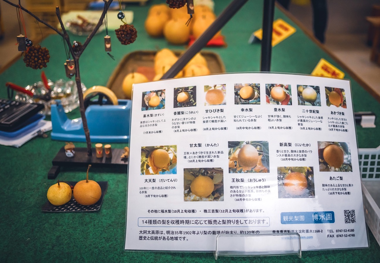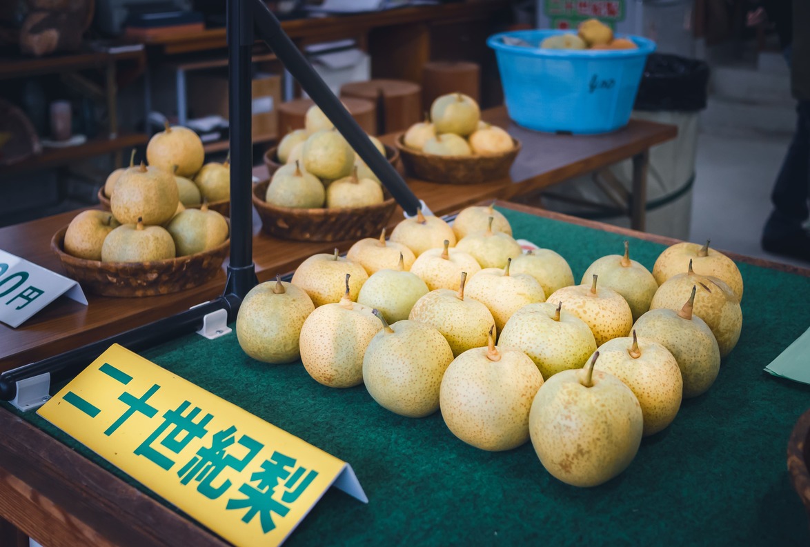We decided to take a trip out to Hakusui-en, a pear orchard on the hill of Oada Highlands in Oyodo town. The orchard dates back to 1894 and now a total of 12 varieties of pears are cultivated here, including classics like Kosui, Nijusseiki, Hosui, and new varieties such as Akizuki and Kanta. Unlike western pears, Japanese pears are large and round and look more like a cooking apple than the bottom-weighted figure eight shape that westerns may be used to.